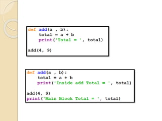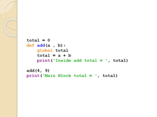 Python functions allow for reusable code through defining functions, passing arguments, returning values, and setting scopes. Functions can take positional or keyword arguments, as well as variable length arguments. Default arguments allow functions to specify default values for optional parameters. Functions are objects that can be assigned to variables and referenced later.