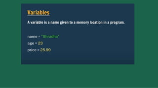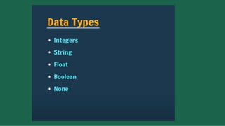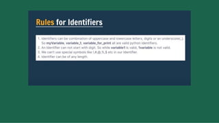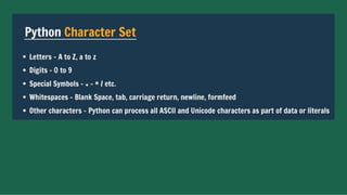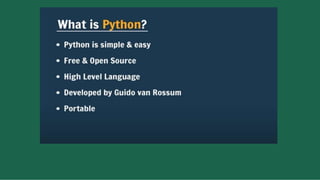 The document provides an introduction to Python programming, highlighting its history, features, advantages, and disadvantages. It explains the uses and applications of Python, installation procedures, and fundamental programming concepts such as variables, data types, and various operators. Additionally, it covers syntax examples and best practices for writing Python code.