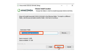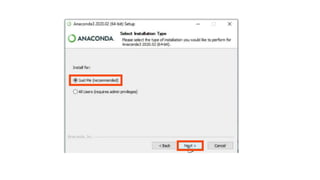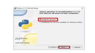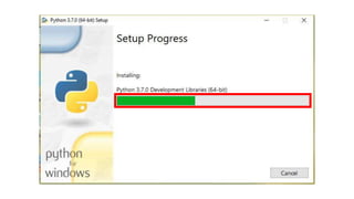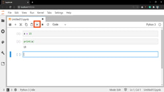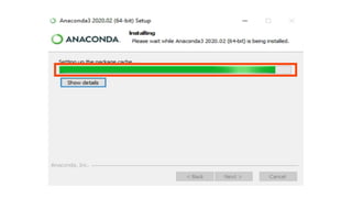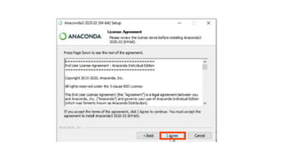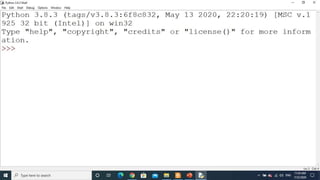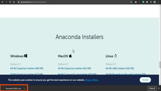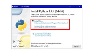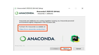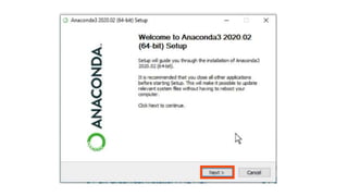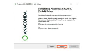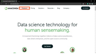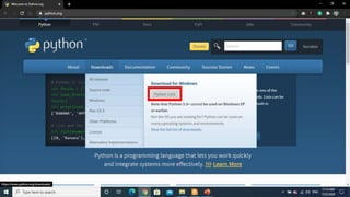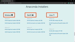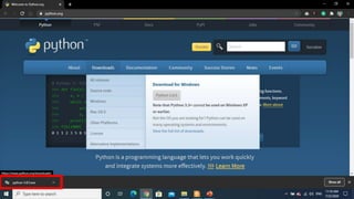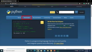 This document discusses an introduction to Python programming. It covers why Python is useful, how it is interpreted instead of compiled, and how to install Python. Specific fields where Python is applicable like civil engineering, electrical systems, mechanics, electronics and computer science are outlined. The first Python program, basic arithmetic operators, and variable types are explained. Finally, it introduces the Anaconda distribution of Python, why it is useful, additional applications it includes and how to install Anaconda.