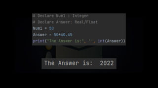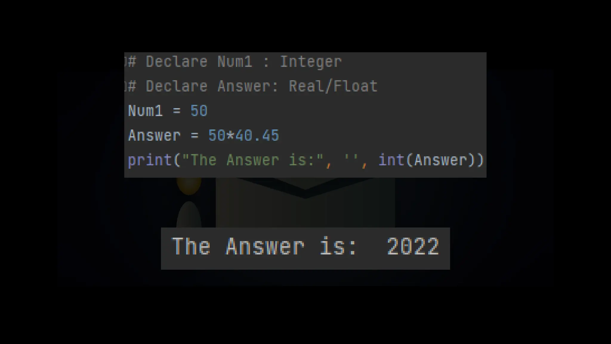 Practice Question Assign 50in a variable (Num1) multiply that number with 40.45 and store the solution in a variable (Answer) and print only the integer part of the Answer with a relevant message and declare all the variables used