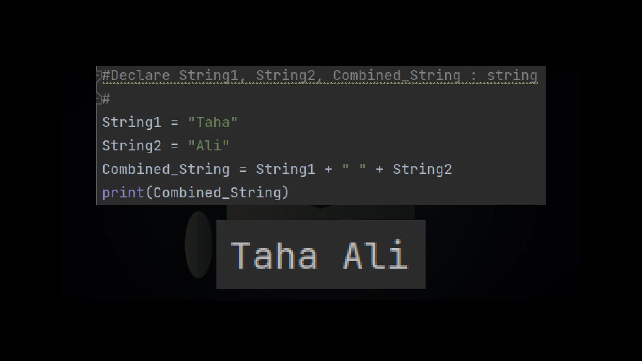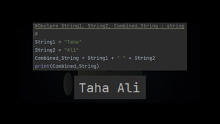Practice Question Assign yourFirst Name in a variable (String1) and your Second Name in a variable (String2) and combined both of the string with space between them and store it in a variable (Combined_String )