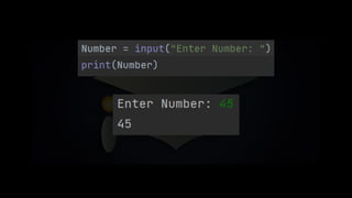 INPUT FROM THEUSER Number = input("Enter Number") Note: In python input function always returns string value so if it's a number then you are suppose to change it into integer or float