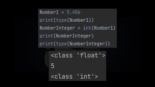 CONVERTING DATATYPES Number 1= 5.456 print(type(Number1)) type() is a function that returns the Datatype NumberInteger = int( Number1) print(type(NumberInteger))
