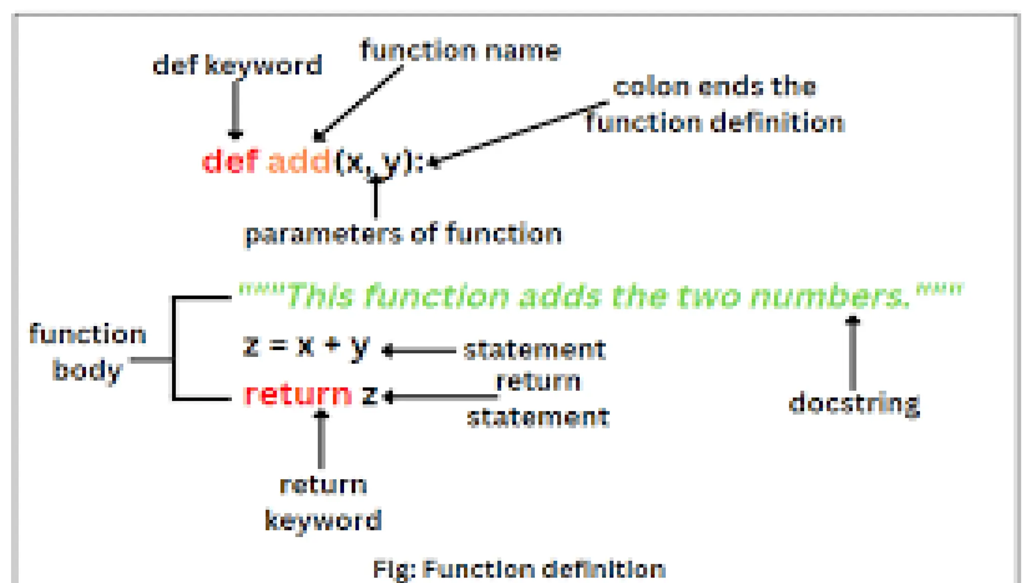 Example: adder = lambdax, y: x + y print (adder (1, 2)) output: 3 Code Explanation • Here, we define a variable that will hold the result returned by the lambda function. 1. The lambda keyword used to define an anonymous function. 2. x and y are the parameters that we pass to the lambda function. 3. This is the body of the function, which adds the 2 parameters we passed. Notice that it is a single expression. You cannot write multiple statements in the body of a lambda function. 4. We call the function and print the returned value.