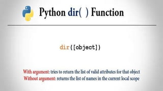 dir() Function Example •import platform x = dir(platform) print(x) • my_list = [1, 2, 3] print(dir(my_list)) import math print(dir(math))