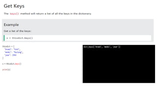 The document provides an overview of Python programming concepts including data types, variables, operators, and collections like lists and tuples. It defines Python as a general purpose programming language created in 1991 that can be used for desktop, web, machine learning, and data science apps. Key data types covered include numbers, strings, lists, and tuples. Operators for arithmetic, comparison, logical, membership, and identity are also summarized. Various list and tuple methods for accessing, modifying, sorting, and joining their items are demonstrated through examples.