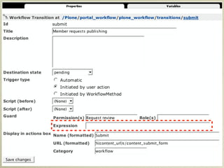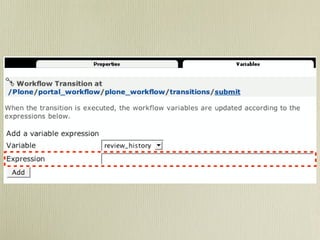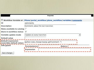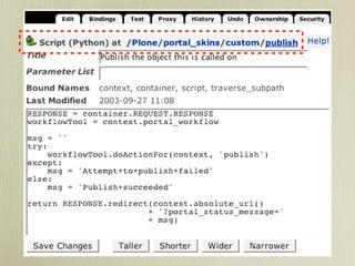The document is a presentation on using Python for Plone development, covering Python basics, variables, data structures, and flow control. It highlights where Python can be applied within Plone, such as in script objects, page templates, and actions. Additionally, it provides resources for further learning and examples of utilizing Python effectively in various components of Plone.
