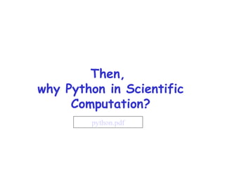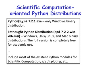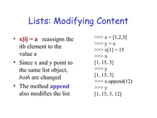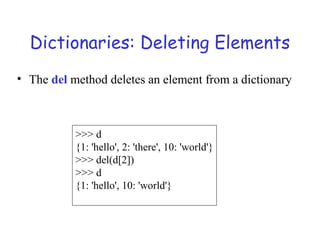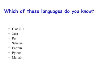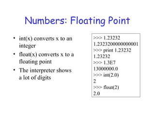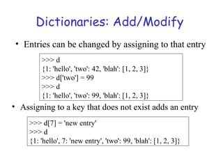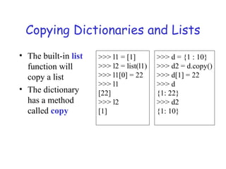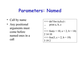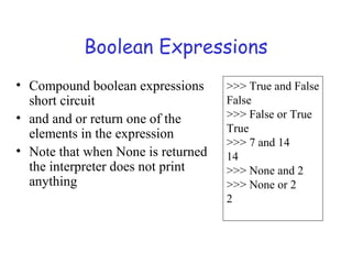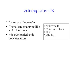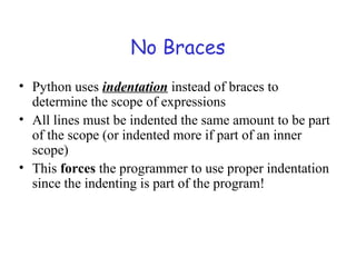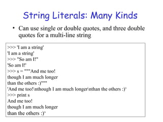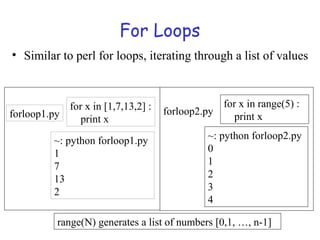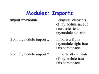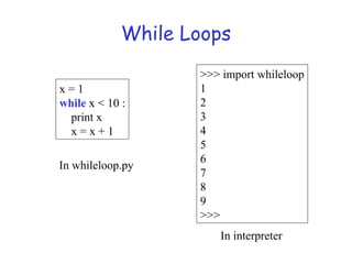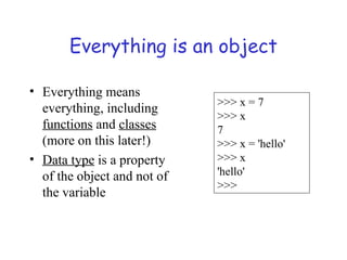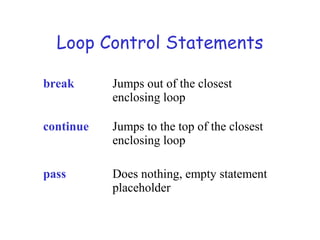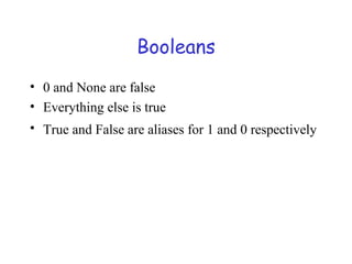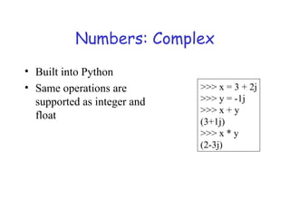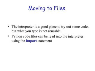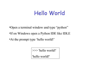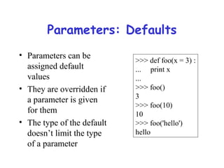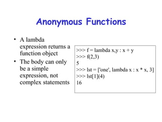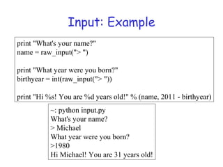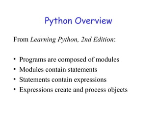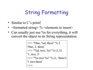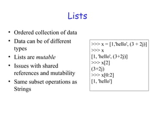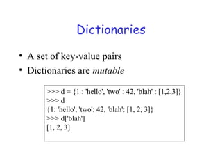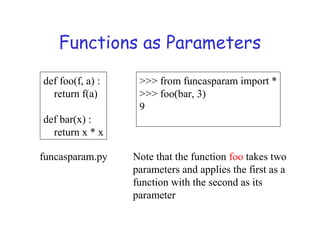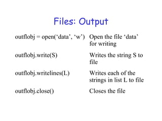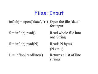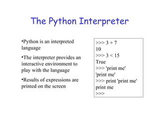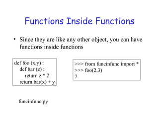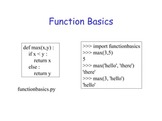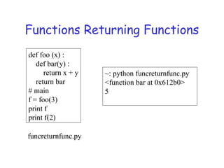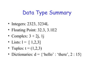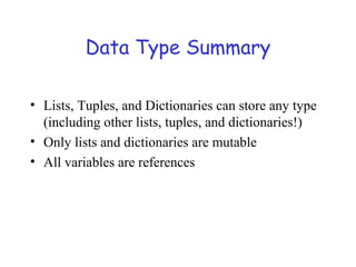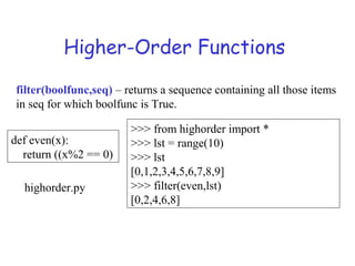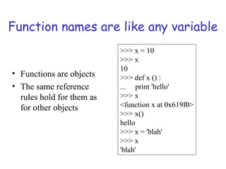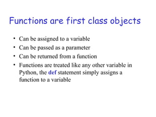 This document provides an overview of the Python programming language. It begins with an introduction to running Python code and output. It then covers Python's basic data types like integers, floats, strings, lists, tuples and dictionaries. The document explains input and file I/O in Python as well as common control structures like if/else statements, while loops and for loops. It also discusses functions as first-class objects in Python that can be defined and passed as parameters. The document provides examples of higher-order functions like map, filter and reduce. Finally, it notes that functions can be defined inside other functions in Python.