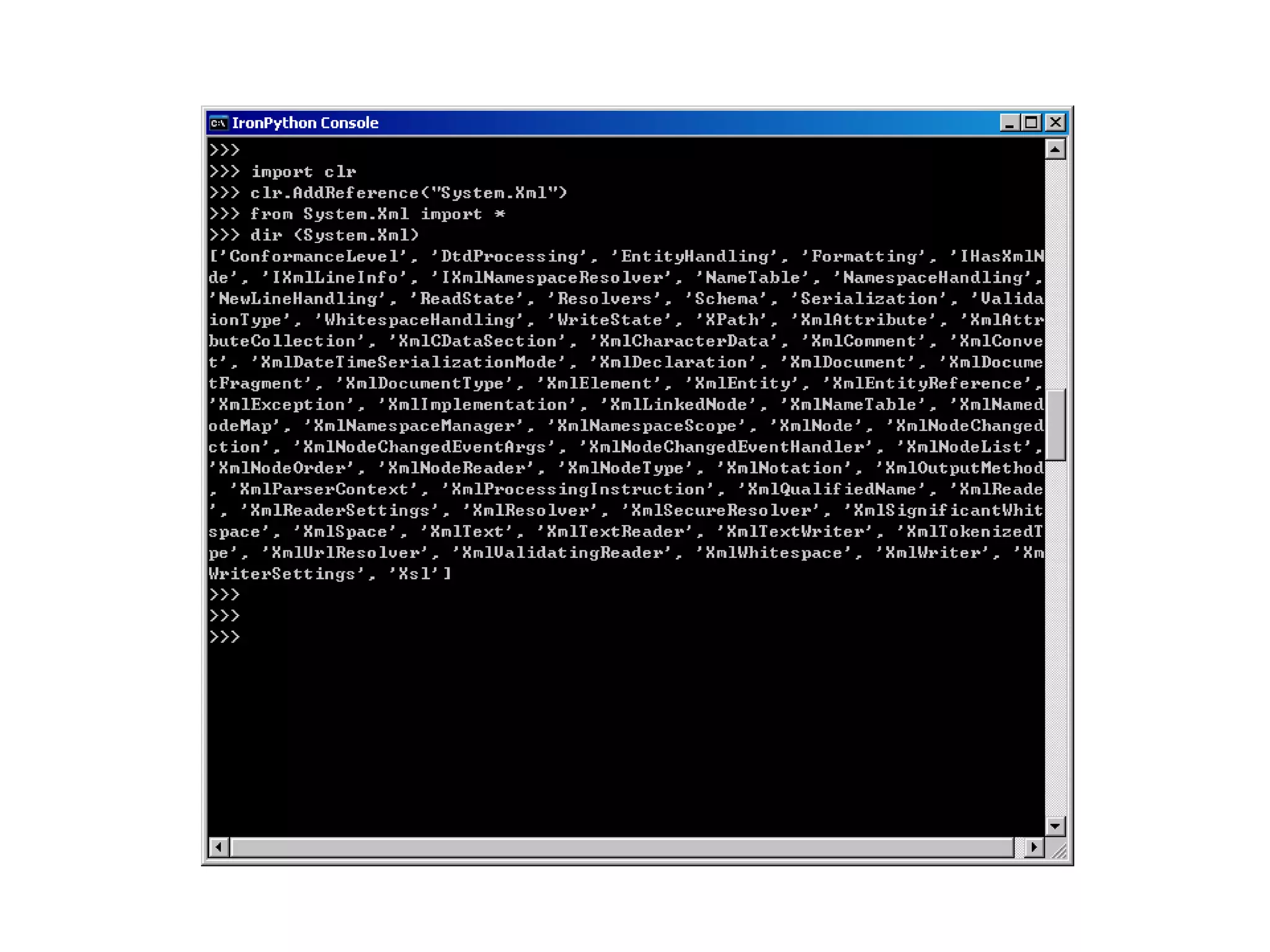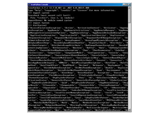 IronPython can be used for scripting .NET applications. Code examples demonstrate loading an XML file and creating a WPF application. Dynamic types allow IronPython code to be used from C#.