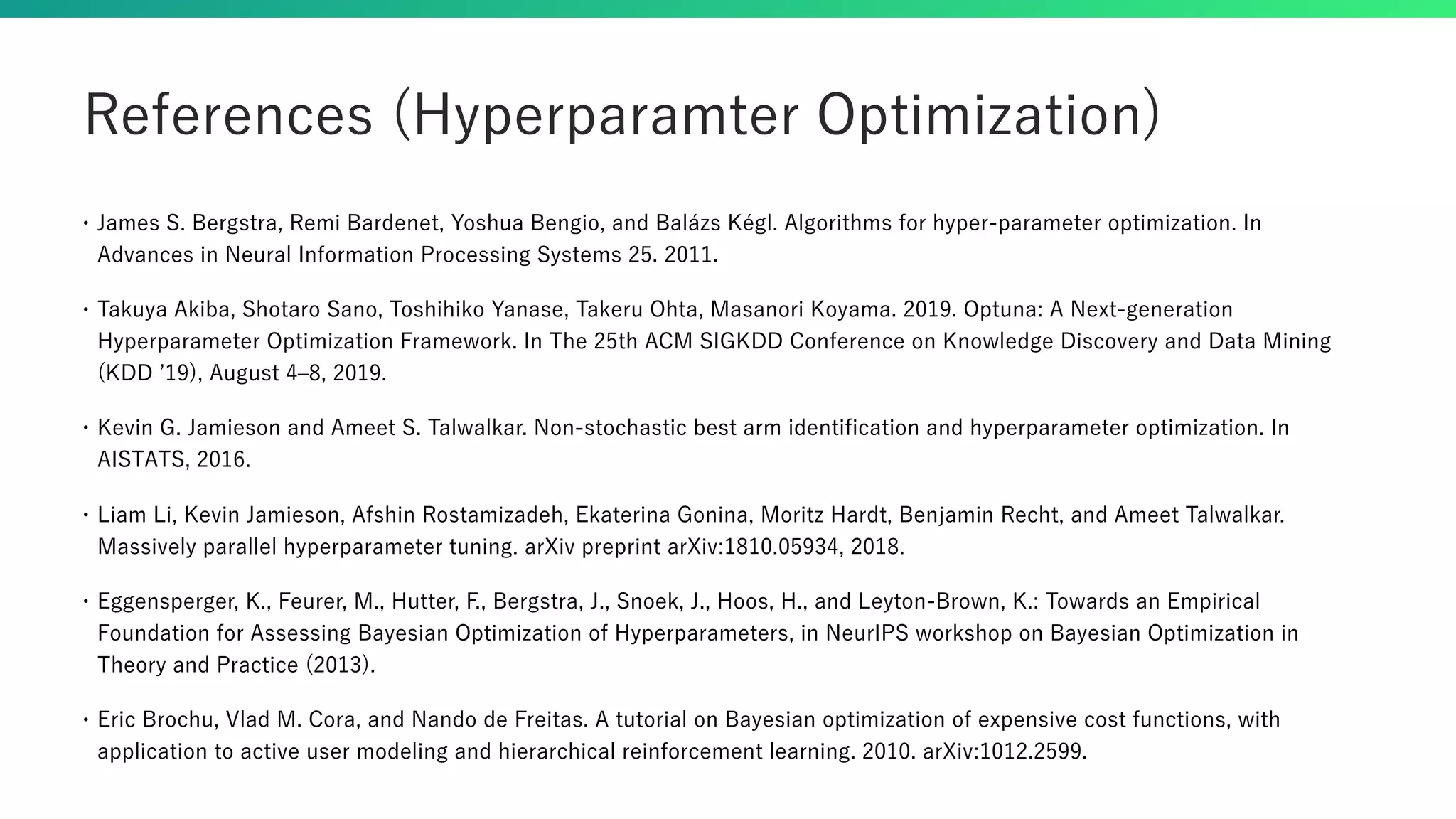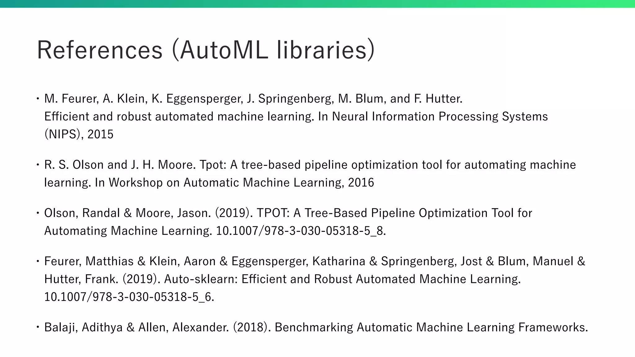 The document discusses various aspects of automated machine learning (AutoML) in Python, covering feature preprocessing, model selection, and hyperparameter optimization techniques. It references notable tools and frameworks, such as Auto-Sklearn, TPOT, Hyperopt, and Optuna, while highlighting methods for feature selection and data cleaning. Additionally, it presents insights from multiple research papers and tutorials related to the advancement of AutoML methodologies.