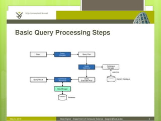 The document discusses the basic steps of query processing which include query parsing and translation to check syntax and transform the query to a relational algebra expression, query optimization to transform the initial query plan into the best plan based on the dataset by specifying operations and algorithms, and query evaluation to execute the optimized query plan and return the results.