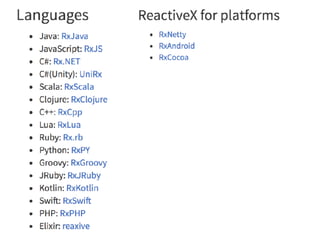 The document provides an introduction to reactive programming concepts using the ReactiveX API. It discusses key reactive programming concepts like observables, observers, and streams that emit values. It shows how to define observables from variables and events, subscribe observers to observables to receive emitted values, and handle asynchronous and threaded behavior. The document also demonstrates how to solve a loading spinner coordination problem between multiple asynchronous requests using reactive programming patterns like combining observables rather than directly manipulating state. It discusses advantages like explicit states, reduced complexity, and error handling but also drawbacks like dependency issues.