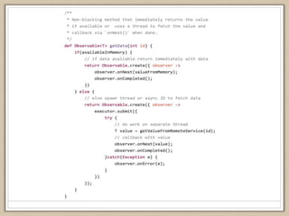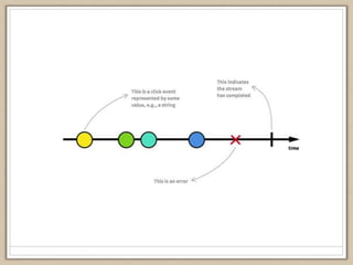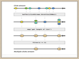 This document provides an overview of reactive programming with RxJava. It begins with introductions to reactive programming and RxJava. It then discusses operators like map, filter, and flatMap that allow transforming and combining observable streams. It covers topics like error handling, threading with schedulers, subscriptions, and backpressure. The document includes examples of how to use various RxJava operators and concepts like transforming streams, handling errors, and improving performance with techniques like throttling.
