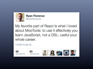 The document discusses React.js, a JavaScript library for building user interfaces. It allows building modular components that efficiently update based on data changes. Many large companies use React, including Facebook, Instagram, and WhatsApp. Components, the virtual DOM, and one-way data binding are the key concepts. Components are reusable UI elements that can have state and handle events. The virtual DOM diffing algorithm allows efficient re-rendering. Data flows unidirectionally from parent to child components.