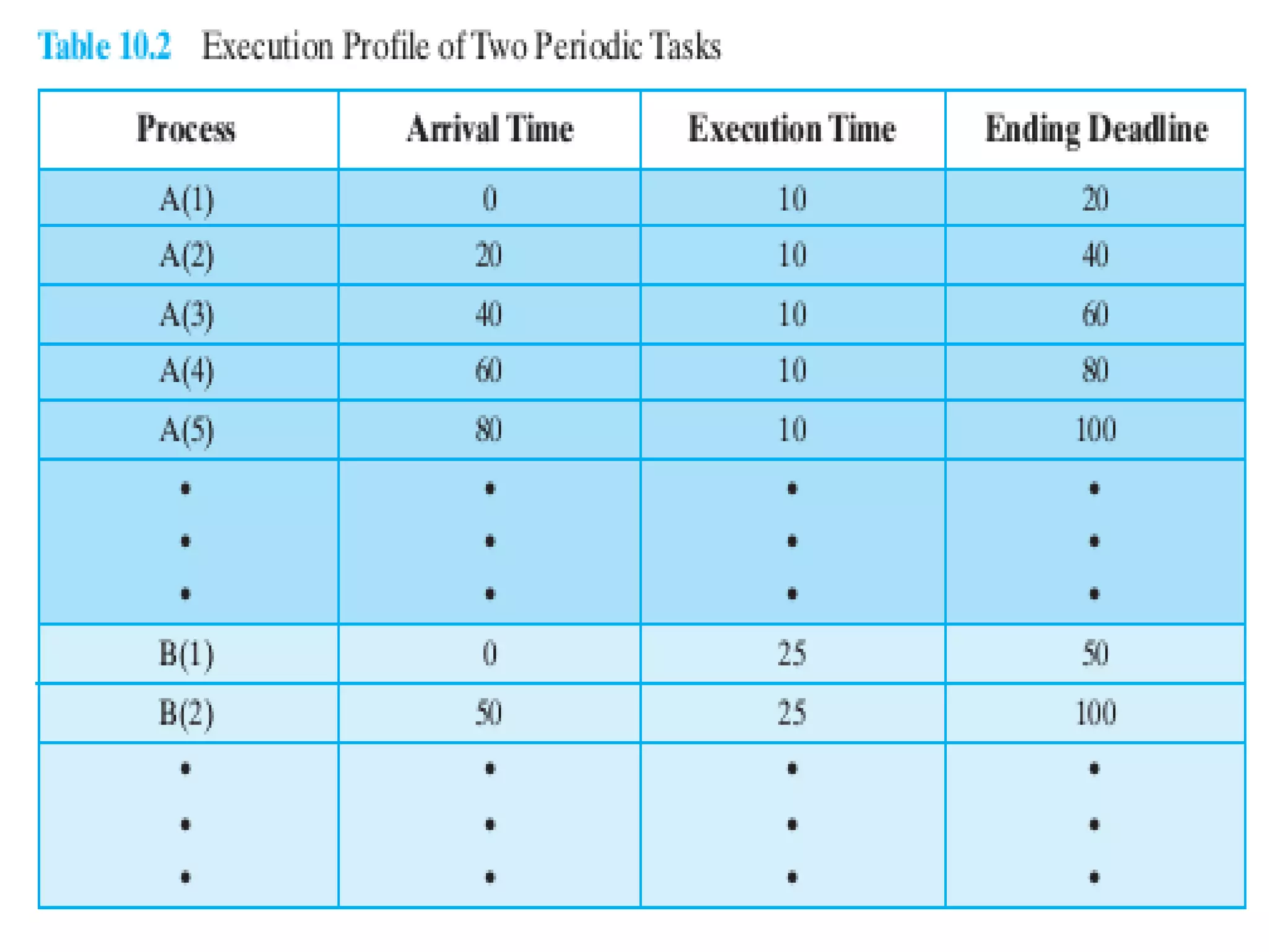 As an exampleof scheduling periodic tasks with completion deadlines, con-sider a system that collects and processes data from two sensors, A and B. The dead-line for collecting data from sensor A must be met every 20 ms, and that for B every 50 ms. It takes 10 ms, including operating system overhead, to process each sample of data from A and 25 mms to process each sample of data from B. Table 10.2 summarizes the execution profile of the two tasks. Figure 10.6 compares three scheduling techniques using the execution profile of Table 10.2. The first row of Figure 10.6 repeats the information in Table 10.2; the remaining three rows illustrate three scheduling techniques.