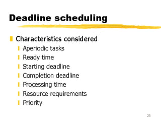 Deadline scheduling isa technique that allows a user to schedule a job by time-of-day, week, month, or year. The job's priority remains in force, but as the deadline approaches, increases the job's priority. Thus, deadline scheduling increases the likelihood that the job will be scheduled for execution by the specified deadline. As a result of deadline scheduling, a job will be reclassified when its priority is changed. There have been a number of proposals for more powerful and appropriate approaches to task scheduling.