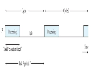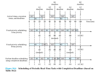 Real time schedulingfollowing some of the algorithms • Static table-driven approaches: These perform a static analysis of feasible schedules of dispatching. The result of the analysis is a schedule that deter-mines, at run time, when a task must begin execution. • Static priority-driven preemptive approaches: Again, a static analysis is per-formed, but no schedule is drawn up. Rather, the analysis is used to assign priorities to tasks, so that a traditional priority-driven preemptive scheduler can be used.