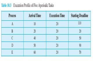the following informationabout each task might be used: : • Ready time: Time at which task becomes ready for execution. In the case of a repetitive or periodic task, this is actually a sequence of times that is known in advance. In the case of an aperiodic task, this time may be known in advance, or the operating system may only be aware when the task is actually ready. • Starting deadline: Time by which a task must begin. • Completion deadline: Time by which task must be completed. The typical real-time application will either have starting deadlines or completion deadlines, but not both.