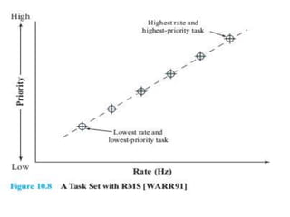 For RMS, thehighest-priority task is the one with the shortest period, the second highest-priority task is the one with the second shortest period, and so on. When more than one task is available for execution, the one with the shortest period is serviced first. If we plot the priority of tasks as a function of their rate, the result is a monotonically increasing function (Figure 10.8); hence the name, rate monotonic scheduling.