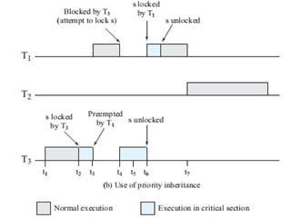 A more seriouscondition is referred to as an unbounded priority inversion, in which the duration of a priority inversion depends not only on the time required to handle a shared resource, but also on the unpredictable actions of other unrelated tasks as well