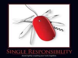 Single Responsibility Principle The Single Responsibility Principle states that every object should have a single responsibility, and that responsibility should be entirely encapsulated by the class. Wikipedia There should never be more than one reason for a class to change. Robert C. “Uncle Bob” Martin www.devreach.com