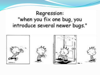 Regression testing is testing performed after changes to a system to detect whether new errors were introduced or old bugs have reappeared. It should be done after changes to requirements, new features added, defect fixes, or performance improvements. There are various strategies for regression testing including re-running all tests, test selection, test prioritization, and focusing on areas like frequently failing tests or recently changed code. While regression testing helps ensure system quality, managing large test suites over time poses challenges in minimizing tests while achieving coverage. Automating regression testing can help address these challenges.