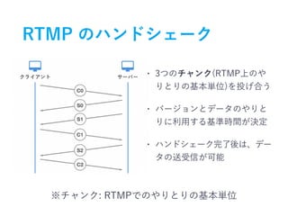 The document discusses RTMP streaming and AbemaTV's use of RTMP. It provides information on RTMP protocol basics, AbemaTV's streaming infrastructure which uses RTMP, and code samples for parsing RTMP network packets. Key technologies mentioned include RTMP, MPEG-DASH, HLS, encoders, and media servers.