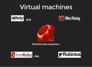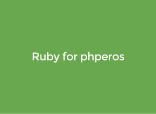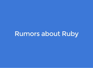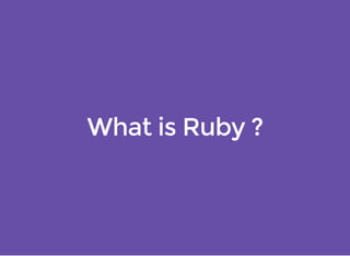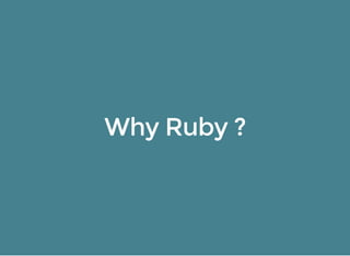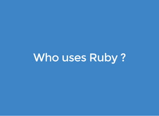 This document provides an overview of the Ruby programming language. It discusses what Ruby is, who uses it, and rumors about it. It then covers why Ruby is used, how it compares to other languages like Java and PHP, its core features and idioms. The document also provides code examples demonstrating Ruby's classes, loops, exceptions, lambdas/procs and more. It concludes by discussing Ruby gems, frameworks like Ruby on Rails, and resources for learning Ruby like IRB, Try Ruby, Codecademy and Bloc's Ruby Warrior.