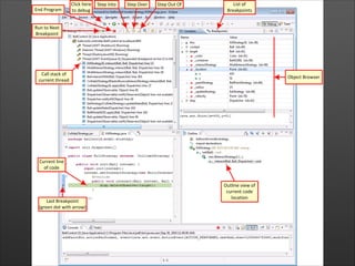 This document discusses using the Pry debugging tool for Ruby programs. Pry allows inserting binding.pry commands in code to drop into a REPL session and debug. It has commands like ls, cd, edit and breakpoint to examine state and set breakpoints. Demos show using Pry to debug tests and controller actions. Pry integrates with Rails and has plugins like pry-rescue and prymounth. Resources listed provide more information on using Pry.