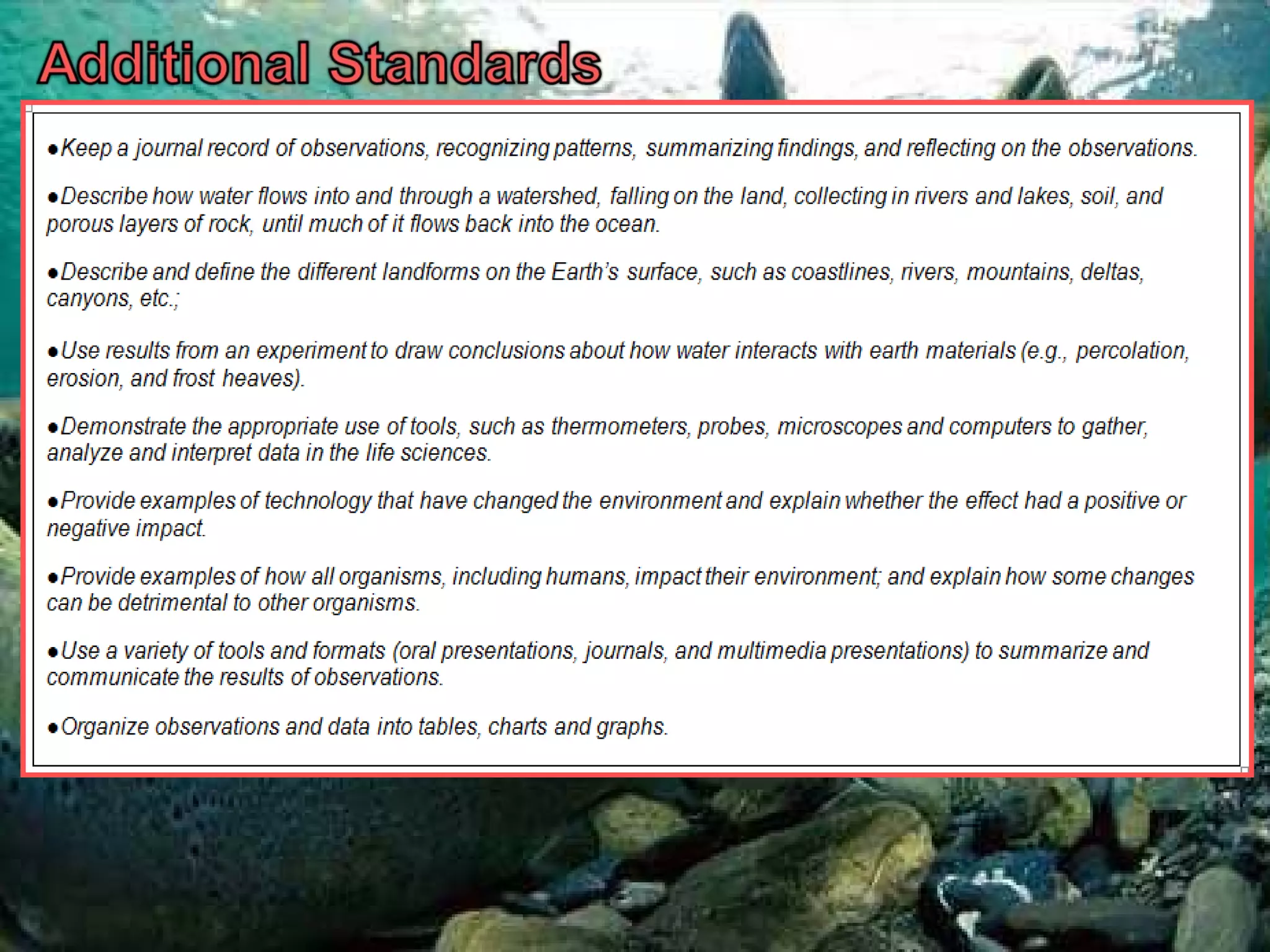 Areas of Focuswithin The Rivers and Water Quality Unit: Watersheds, Rivers of the United States, Sections of a River, Parts of River (Vocabulary), Stream Order, Erosion and Deposition, Water Quality, Chemical Properties of Water, Bio-Indicators of Water Quality (EPT richness), Physical Properties of Water Quality, Rivers and Flooding, Factors that Control Flooding, Types of Flooding, Tsunami’s, Wetlands, Flood Prevention, Levees, Dams and Ecosystem, Importance of Dams, Impacts of Dams, Hydropower, Parts of Dam, Salmon (Life Cycle), Systems of Help Salmon, Fish (General), Layering in a Lake, Lake Turnover, Nutrients and Lakes. Full Unit can be found at… http://sciencepowerpoint.com/River_and_Water_Quality_Unit.h tm