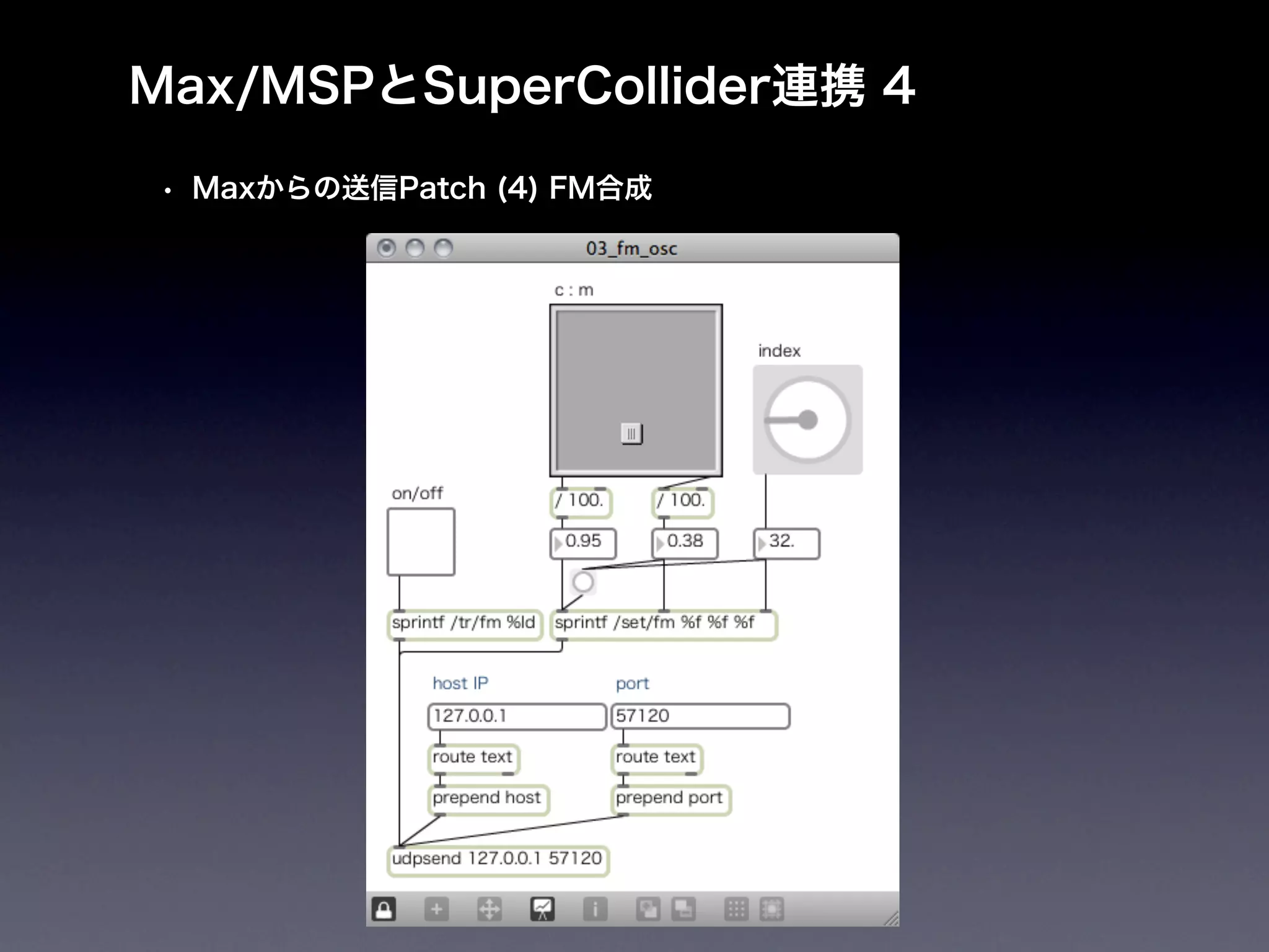 ON/OFF t = OSCresponderNode(nil, '/tr/fm', { arg time,responder,msg; if(msg[1] == 1, { s.sendMsg("/s_new", "fm", x = s.nextNodeID, 0, 1)}, { s.sendMsg("n_free", x)} ); }).add; // SynthDef Responder // u = OSCresponderNode(nil, '/set/fm', { arg time,responder,msg; s.sendMsg("/n_set", x, "carPartial", msg[1], "modPartial", msg[2], "index", msg[3]); }).add;