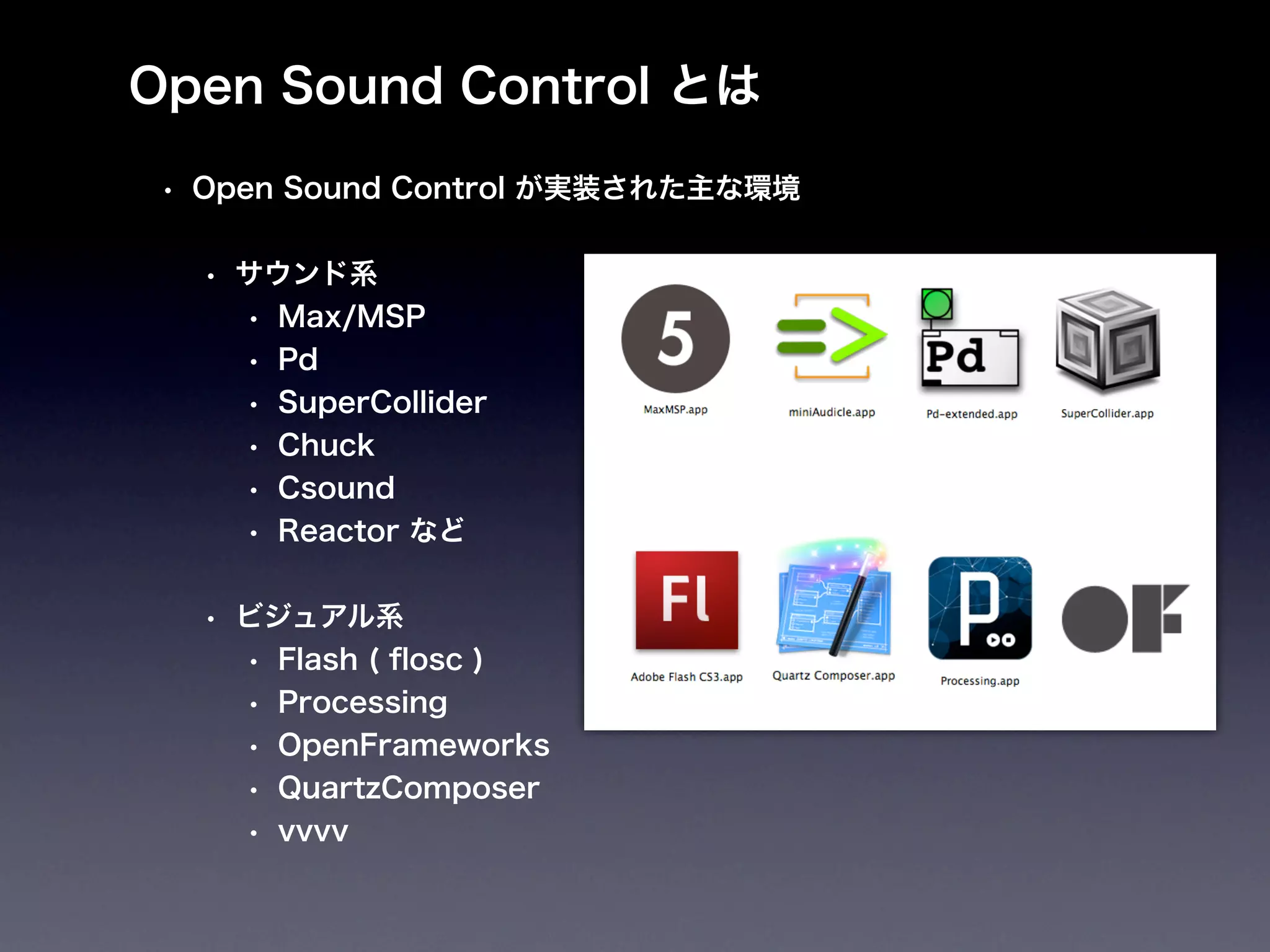 「クリエイティブ・ミュージック・コーディング」- オーディオ・ビジュアル作品のための、オープンソースなソフトウエア・フレームワークの現状と展望