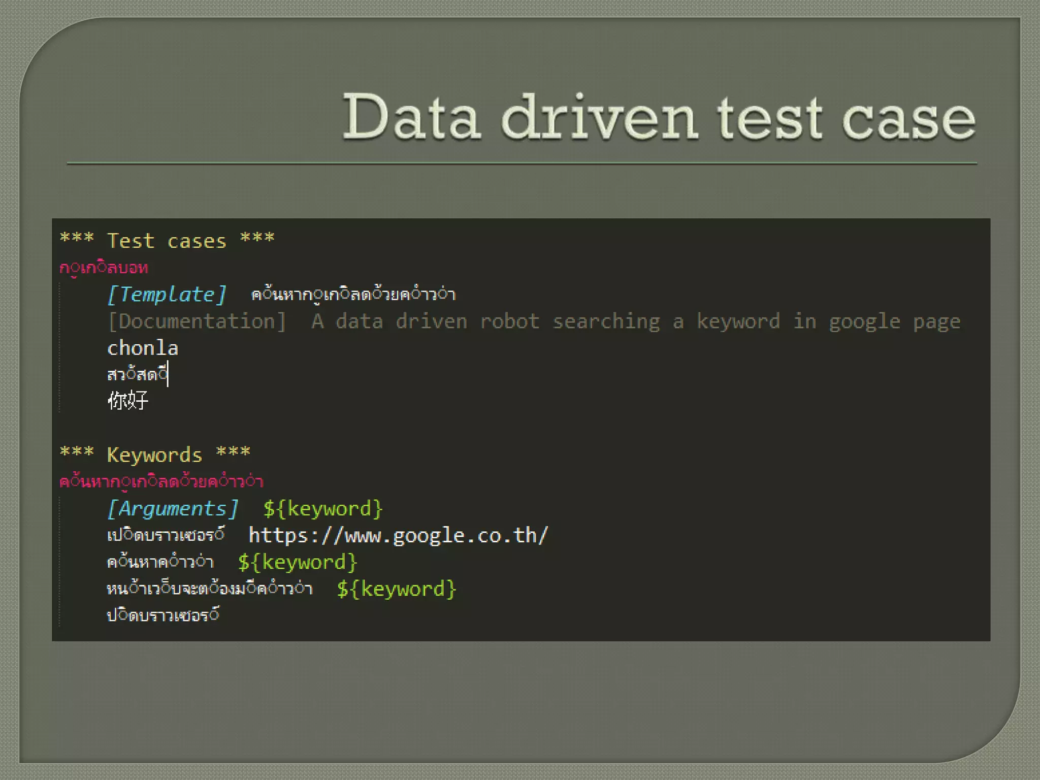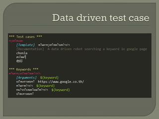 This document provides an overview of test case formatting and structure in Robot Framework. It discusses test case files, the editor used, table structure including test cases, settings, keywords and variables. It also covers syntax elements like spacing, argument separators, and comments. Additionally, it explains how to create keywords, pass parameters, use setup/teardown, and address elements. It concludes with examples of simple test scenarios and encourages enjoying test automation.
