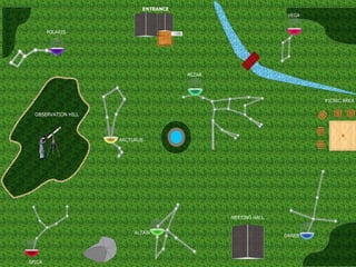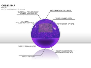 The document proposes designing an environment in a rural area to support astronomical observation and education. It would involve constellations represented by LEDs on the ground, an interactive robot named Orbie Star to provide information, and Lumalive scarves that play music related to stars. Users could learn about and locate constellations using their mobile phones and these interactive tools.