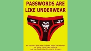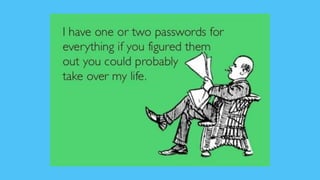 The document discusses the vulnerability of humans in cybersecurity, highlighting that 70% of companies consider people their greatest weakness. It emphasizes the importance of strong, unique passwords and two-factor authentication, and introduces password managers as a solution for secure password management. The document also covers potential hacking methods and provides guidance on what individuals and companies should do after a security breach.