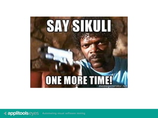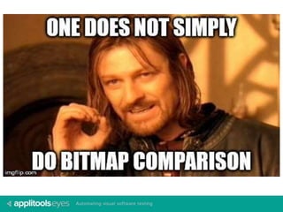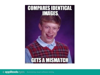 The document discusses the necessity and benefits of automated visual testing, emphasizing its importance due to the complexity of test matrices that include various browsers and resolutions. It provides an overview of tools and technologies used for visual testing, including Applitools Eyes, PhantomCSS, and others. The document also outlines the workflow for visual testing and highlights potential challenges such as false positives and dynamic content.