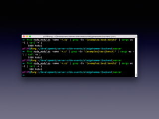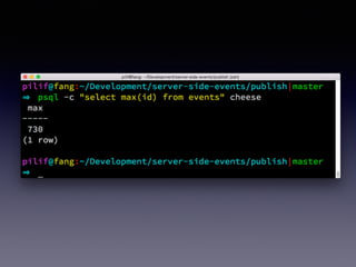 The document discusses different techniques for implementing server-sent events, including short polling, long polling, Server-Sent Events, and WebSockets. Code examples are provided for implementing server-sent events using WebSockets, Server-Sent Events, and long polling with Redis pub/sub. Fallback techniques are also described to handle events if the main infrastructure is not available.
