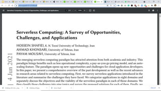 1. The document discusses serverless computing and its advantages over traditional server-based systems like scalability and reduced costs.