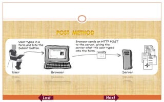 The document discusses web servers, web browsers, and how they communicate via HTTP. It explains that the browser makes requests to the server, and the server responds by sending back content like HTML pages, images, and other resources. It also provides details on HTTP methods like GET and POST, and how browsers use HTML and CSS to render and display web pages for users.