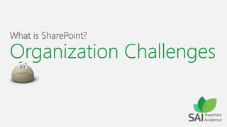 SharePoint is a web-based collaboration platform that allows users to access and manage documents, spreadsheets, photos, and other files from any device with a web browser. It provides features for document management, search, collaboration, workflows and business intelligence. SharePoint includes core capabilities for content management, along with additional features for portal creation, communities, composites, insight and search.