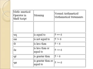The document provides information about shells in Linux operating systems. It defines what a kernel and shell are, explains why shells are used, describes different types of shells, and provides examples of shell scripting. The key points are: