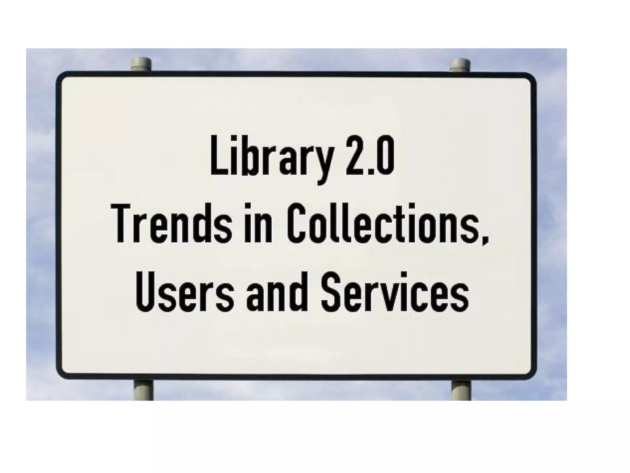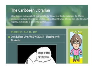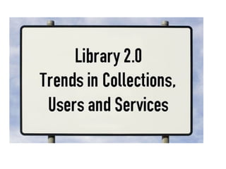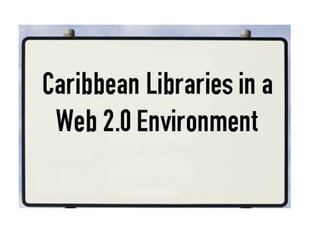 The document discusses trends in libraries and how libraries are adapting to new technologies and user behaviors. It covers the growth of the internet and web 2.0 technologies. It describes how libraries are using web 2.0 tools like blogs, wikis and social media to provide services and engage users. Examples are given of Caribbean libraries that have implemented virtual reference, mobile websites, and social media presences. The goal of library 2.0 is to bring the library closer to users and emphasize convenience, personalization and collaboration.
