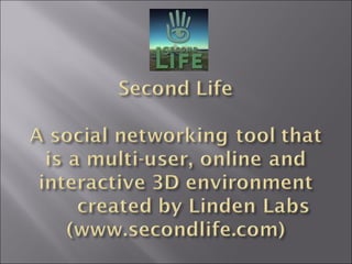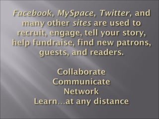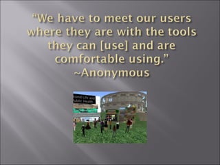 The document discusses various social media tools that a university library can use to connect with students, patrons, and the community. It provides statistics on the popularity of tools like Facebook, Twitter, and Second Life. It also lists some of the activities the library is directly involved in, such as book discussions, providing resources to the homeless and more.
