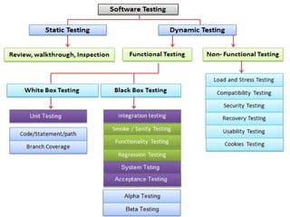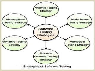 Lesson Two discusses software testing strategies and principles. Testing strategies provide a plan for defining the testing approach. Common strategies include analytic, model-based, and methodical testing. Key principles of testing include showing presence of defects, early testing, and that exhaustive testing is impossible.