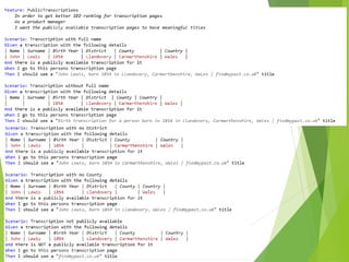 The document discusses the causes of software failure, primarily focusing on issues with requirements such as incompleteness and misunderstandings among stakeholders. It advocates for a collaborative approach to writing requirements and testing early through techniques like 'specification by example' to ensure clarity and ownership. Additionally, it emphasizes the importance of living documentation and maintaining a single source of truth for examples, requirements, and automated tests.