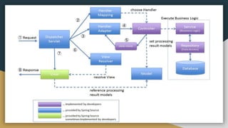 The document provides an overview of software frameworks, focusing on the Spring Framework as an alternative to Enterprise Java Beans (EJB). It highlights Spring's advantages such as lightweight design, reusability, and support for various programming practices, along with comparisons to EJB across several parameters like transaction management and state management. Additionally, it outlines the Spring MVC architecture and its components, emphasizing its benefits for web application development.