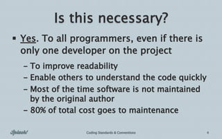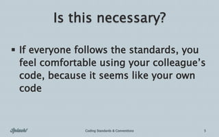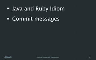 This document outlines coding style guidelines for various aspects of Ruby code including indentation, whitespace, naming conventions, comments, and other stylistic elements. It discusses formatting recommendations for indentation, line lengths, alignment, blank lines and spaces, trailing whitespace, declarations, dead code, and use of parentheses. It also provides tips for commit messages, and style guidelines for models, views, and controllers in Ruby on Rails. The document is intended as a reference for writing clean, readable Ruby code.