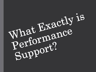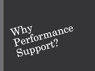 The document discusses the concept of performance support, which offers task guidance and productivity benefits precisely when needed. It emphasizes the importance of understanding the problem, selecting the right stakeholders, and starting small while thinking big for scalability. Lastly, it highlights that performance support is a journey that should focus on performance rather than using the term itself.