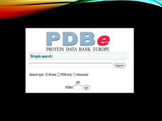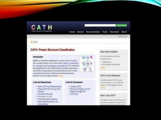 Structural databases like PDB, CSD, and CATH contain 3D structural information of proteins, small molecules, and macromolecules determined through techniques like X-ray crystallography and NMR spectroscopy. These databases provide bibliographic data, atomic coordinates, and other details for each entry. PDB contains protein structures, CSD contains organic and metal-organic structures, and CATH classifies protein domains hierarchically. Structural databases have wide applications in structure prediction, analysis, mining, comparison, classification, structure refinement, and database annotation.