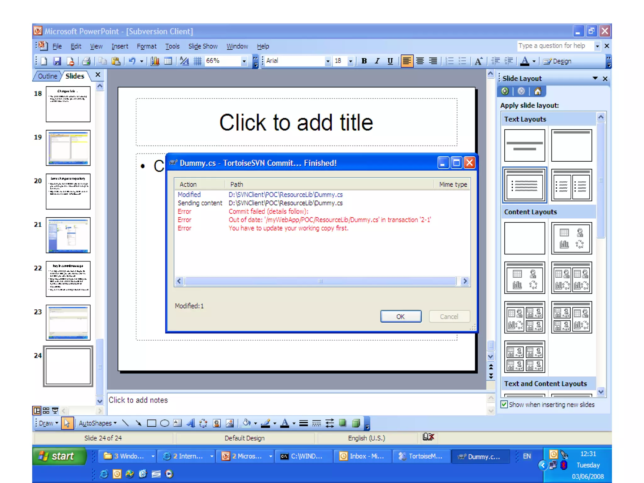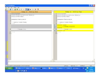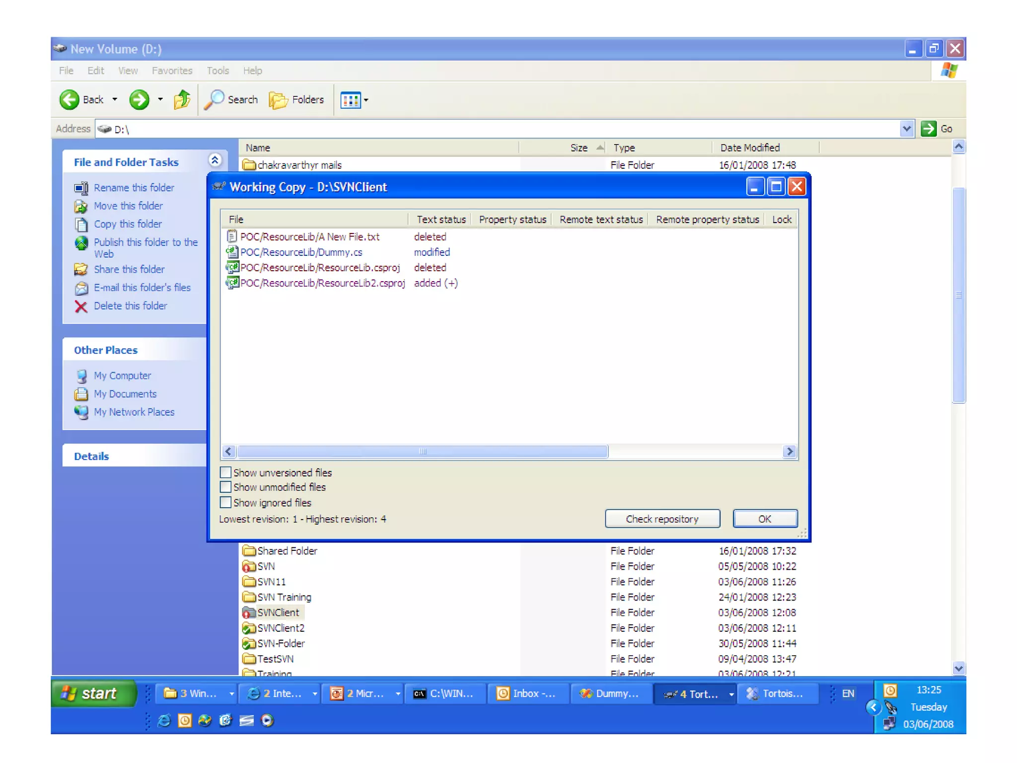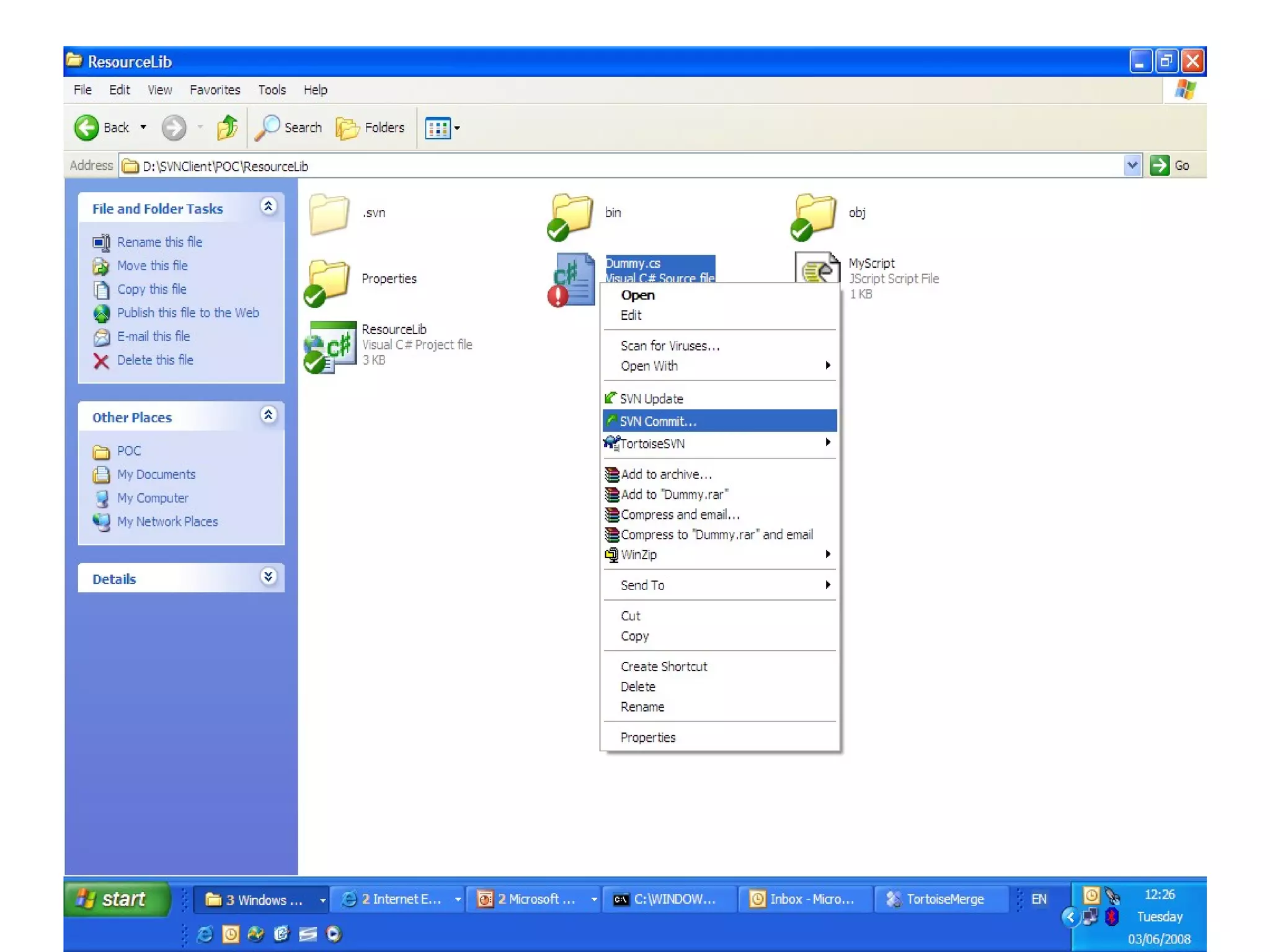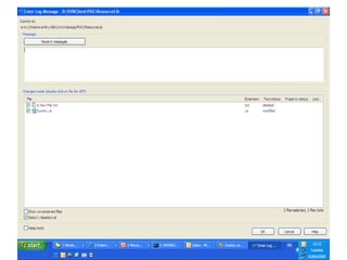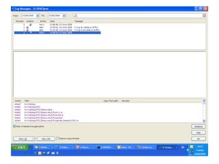 This document provides instructions on how to use the TortoiseSVN client to interact with a Subversion repository. It describes how to checkout a working copy from the repository, make changes to files, commit changes back to the repository, resolve conflicts, and view the history of changes. It also provides definitions for common Subversion terms like commit, update, merge, and working copy.